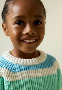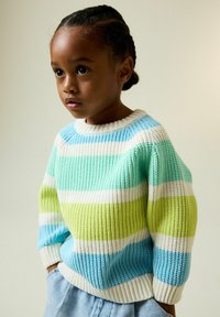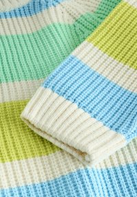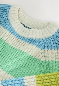 Pull en tricot avec larges rayures horizontales en bleu clair, vert, blanc et jaune. Encolure et poignets côtelés, coupe décontractée, texture tissée.