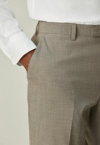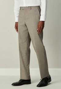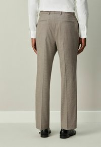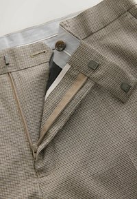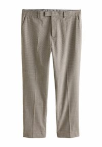 Pantalon beige à motif avec une coupe décontractée, doté d'une fermeture à bouton et à glissière, de deux poches avant et d'une texture de tissu lisse.