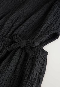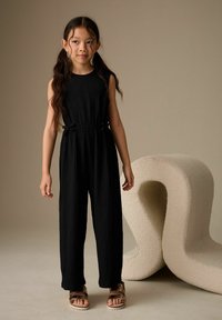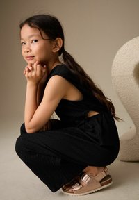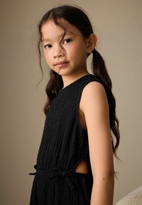 Jeune fille aux longs cheveux noirs coiffés en couettes, portant une robe noire texturée sans manches avec des découpes sur les côtés, debout devant un fond beige.