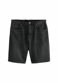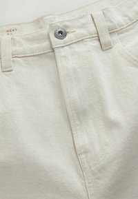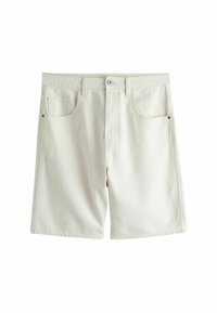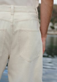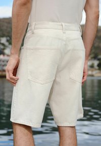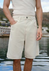 Homme portant un short crème et un haut sans manches crème, debout près de l'eau avec une ville floue et une colline en arrière-plan.