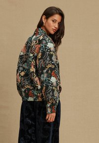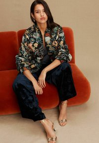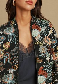 Veste bomber noire avec broderies florales et animales colorées, fermeture éclair et poignets côtelés. Offre une coupe décontractée et une texture douce.