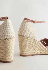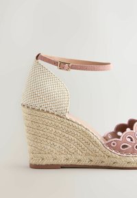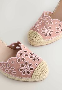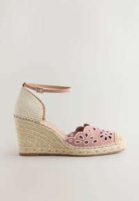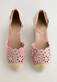 Sandale espadrille compensée avec devant en daim rose à découpe florale, talon en fibre naturelle tissée, et bride de cheville rose avec fermeture à boucle.