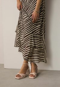 Pied portant une sandale à talon bloc beige à bout ouvert avec bride à la cheville, associé à un ourlet de jupe rayée marron et blanche.