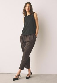 Femme portant des escarpins noirs à bout pointu avec brides nouées à la cheville, associés à un pantalon sombre et ajusté, debout sur un sol lisse.
