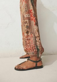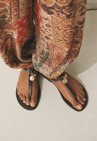Pieds nus portant des sandales en cuir noir avec des breloques en forme de pièces d'or, partiellement couverts par un pantalon ample à motifs sur un sol beige.