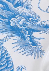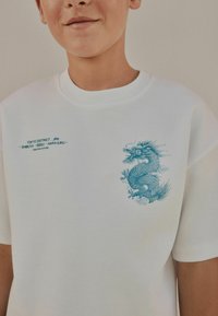 Garçon portant un t-shirt blanc avec un motif de dragon bleu, un short blanc et des baskets, se tenant contre un mur beige et orange.