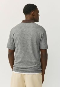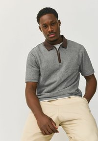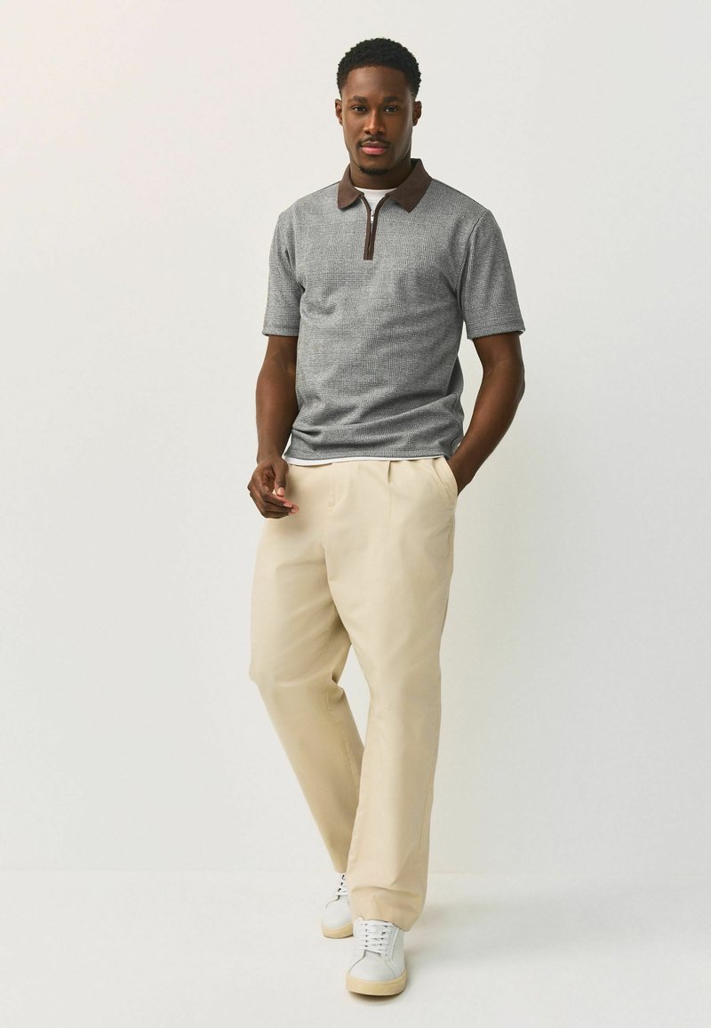 Homme portant un polo gris à manches courtes avec un col marron, un pantalon beige et des baskets blanches, debout avec une main dans la poche devant un fond uni.