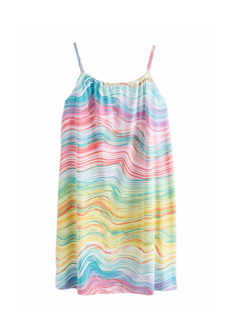 Robe sans manches à fines bretelles avec un motif rayé ondulé multicolore dans des tons pastel de rose, bleu, jaune et vert.