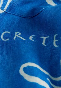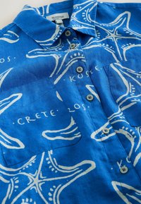 Chemise bleue à boutons avec des étoiles de mer blanches et des noms d'îles grecques imprimés, comportant deux poches poitrine et des manches longues.