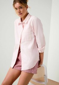 Femme portant une chemise rose pâle à boutons avec une poche poitrine et un short rayé rose, debout devant un fond blanc uni.