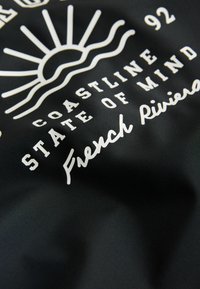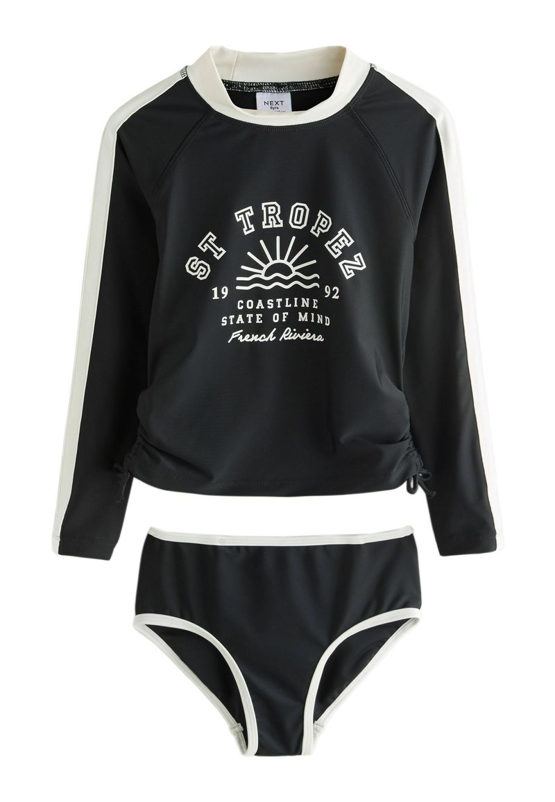 Haut rash guard noir à manches longues avec bordure blanche et bas de bikini assortis, avec le texte « St Tropez Coastline State of Mind French Riviera » et un motif soleil.