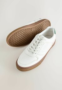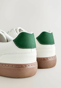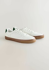 Baskets basses blanches avec semelle en caoutchouc marron et languette de talon verte, dessus en cuir texturé et lacets blancs, vues de profil.