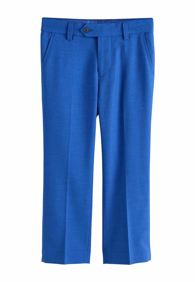 Pantalon de tailleur bleu vif avec poches avant, passants pour ceinture et une fermeture à bouton unique sur fond blanc.