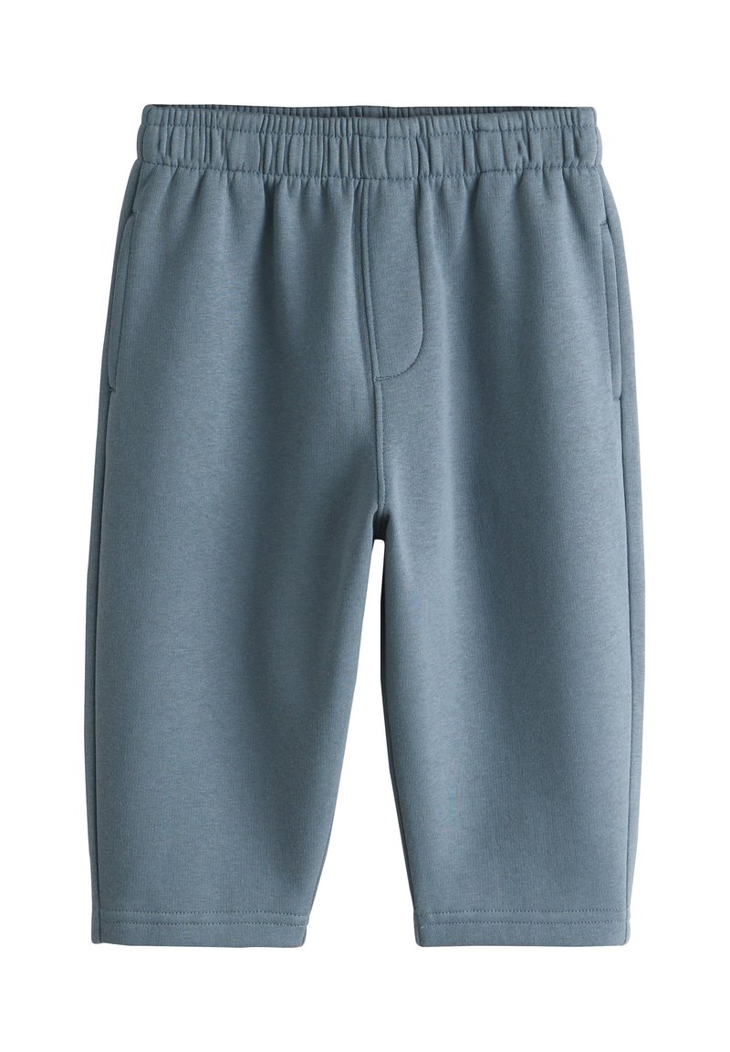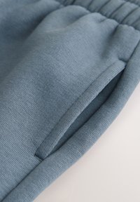 Short bleu à taille élastique avec poches latérales, longueur genou, en tissu doux, présenté sur fond blanc.