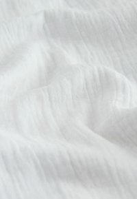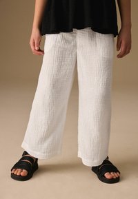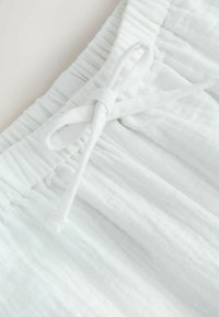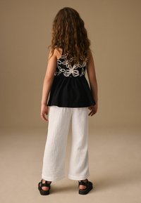 Fille souriante aux cheveux bouclés portant un haut noir sans manches avec des motifs floraux blancs, un pantalon blanc ample et des sandales noires, debout sur un fond beige.