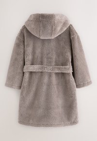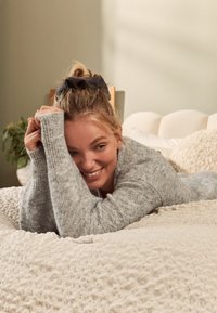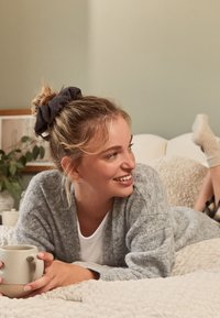 Femme en pantalon à carreaux et cardigan gris s'étirant les yeux fermés, assise en tailleur sur un lit dans une chambre confortable décorée de plantes.