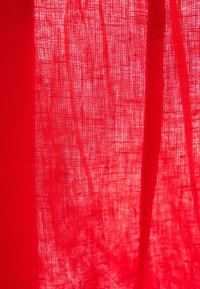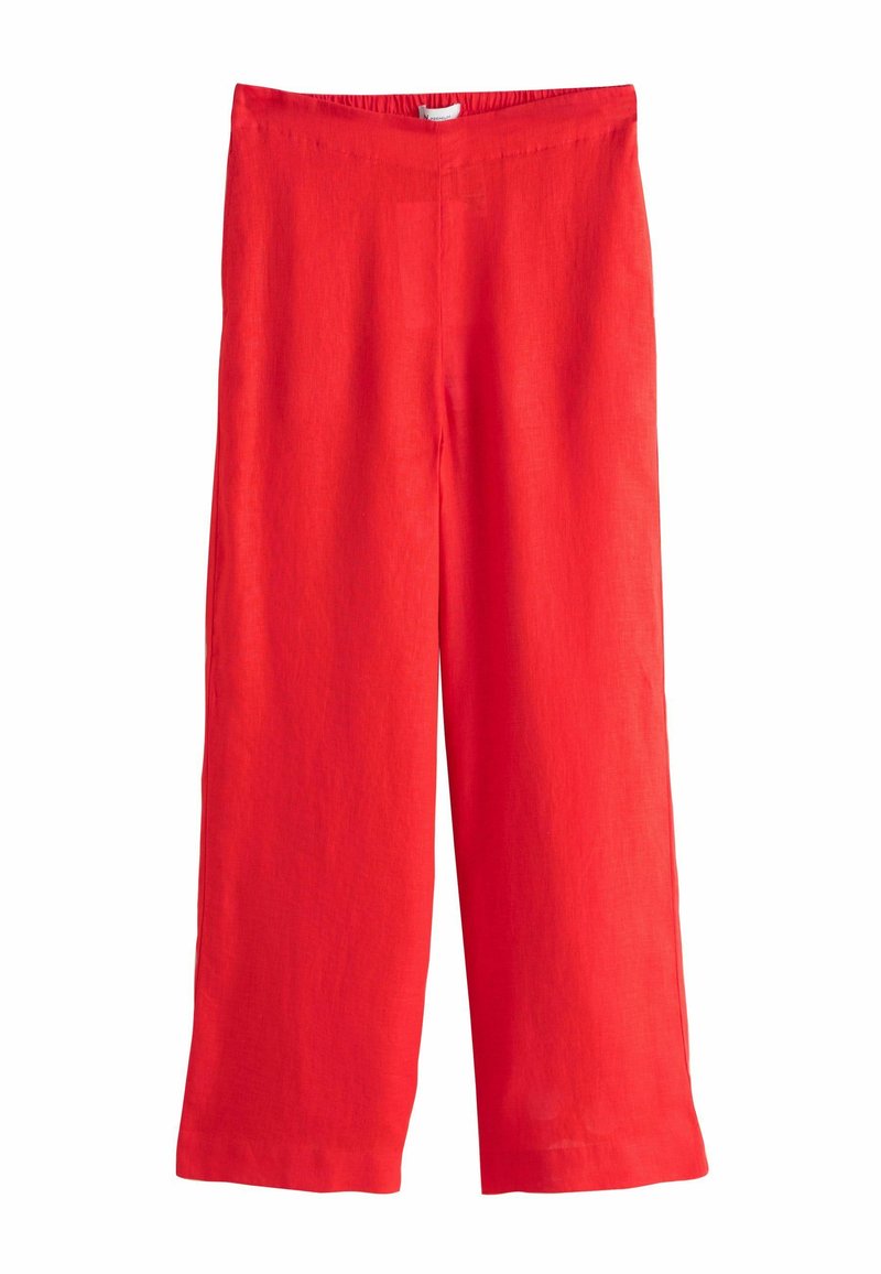 Pantalon large en lin rouge avec une taille élastique, design sans coutures et texture légèrement froissée, offrant une coupe décontractée et ample.