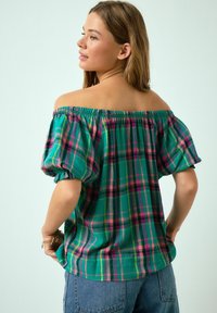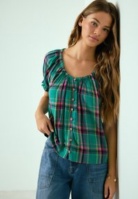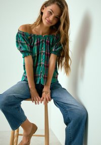 Jeune femme appuyée contre un mur, portant un chemisier à carreaux verts et roses boutonné et un jean bleu ample, avec de longs cheveux ondulés détachés.