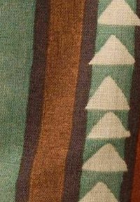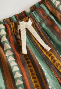 Shorts pour enfants à taille élastique avec des rayures verticales en vert, marron, orange et jaune, arborant des motifs géométriques et un cordon blanc.