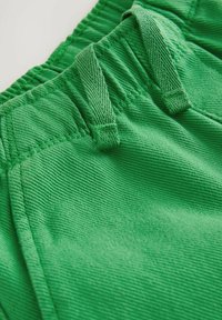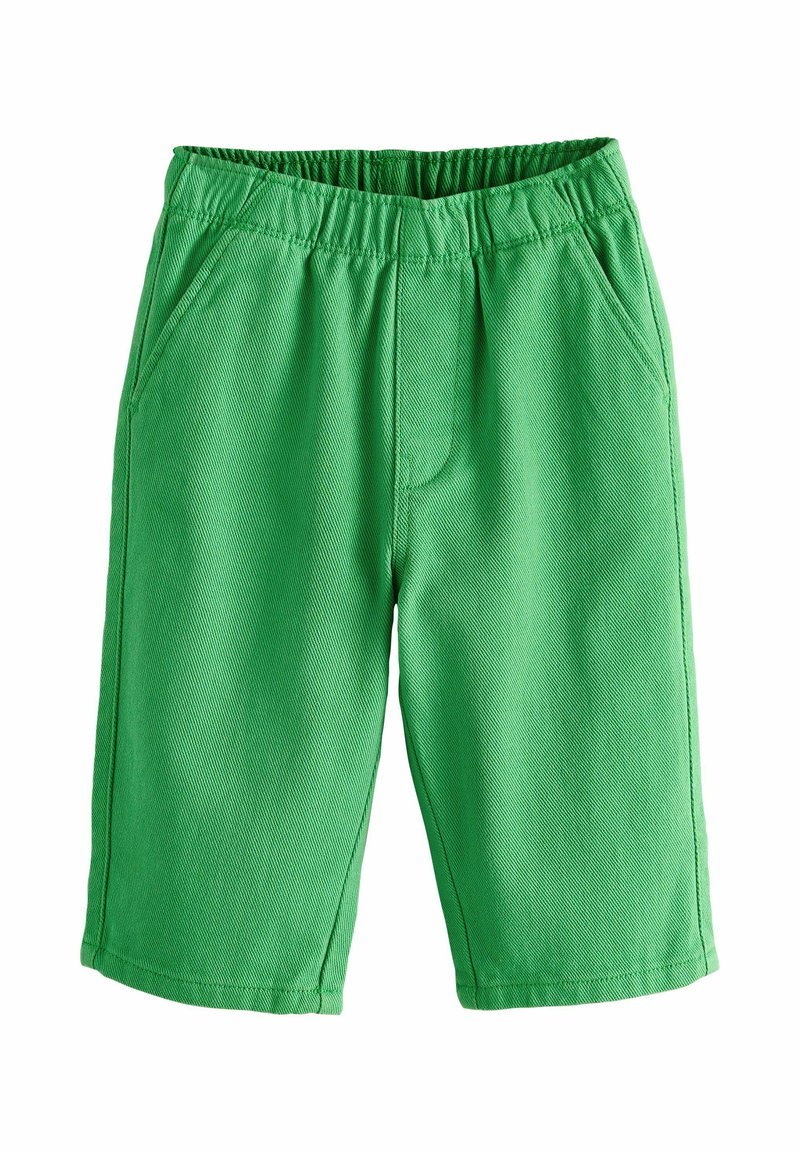 Shorts verts arrivant aux genoux avec taille élastique et poches avant, présentés sur un fond blanc.
