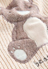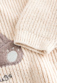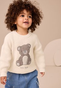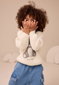 Jeune enfant aux cheveux bouclés portant un pull crème avec un motif d’ours en peluche, un jean cargo bleu et des baskets blanches, debout les bras étendus.