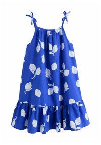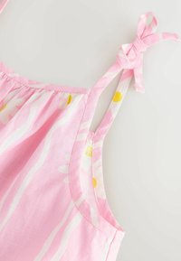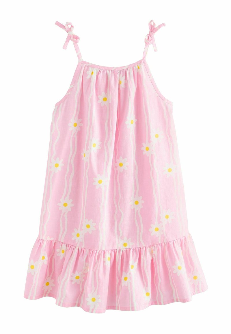 Robe rose sans manches avec motif de marguerites blanches et jaunes, ourlet volanté et bretelles ajustables à nouer sur un fond blanc uni.