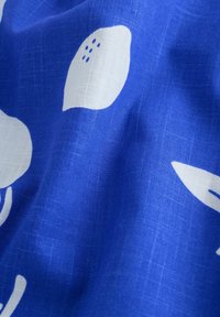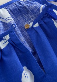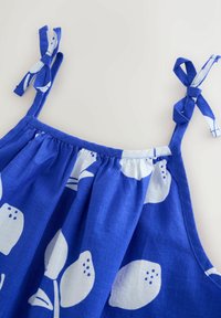 Robe bleue sans manches avec des imprimés de citrons blancs, des bretelles nouées aux épaules et un ourlet à volants.