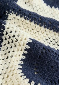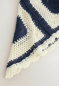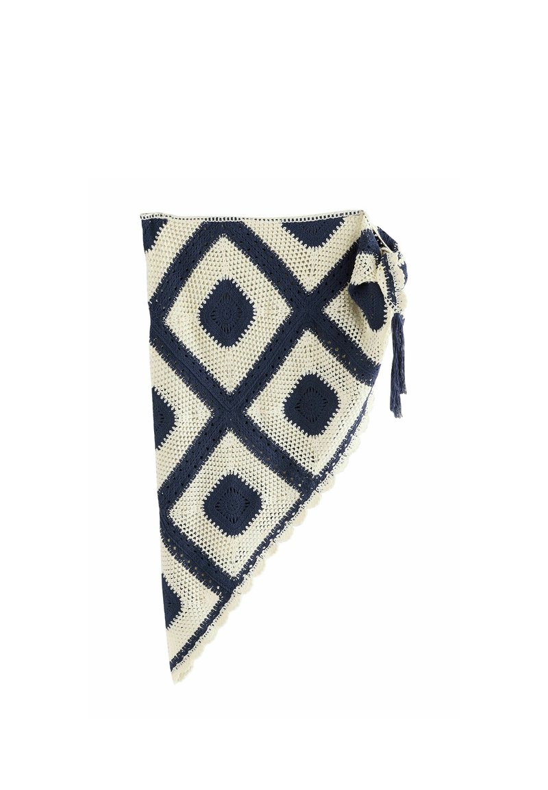 Châle triangulaire crocheté en crème et bleu marine avec des motifs en losange et un détail de pompon noué sur un côté.