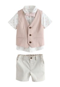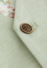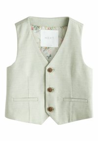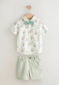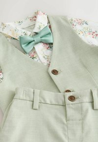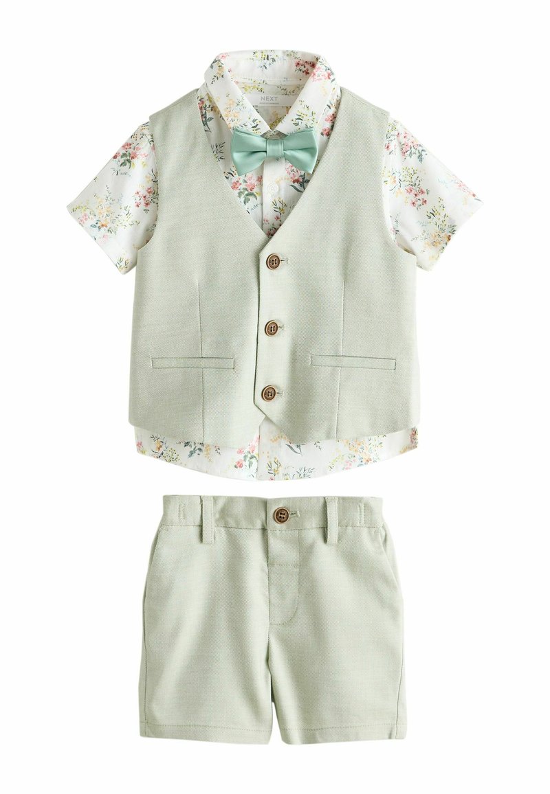 Costume vert clair pour tout-petit avec gilet boutonné, short, chemise à manches courtes à motif floral et nœud papillon vert assorti.