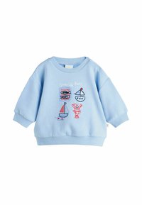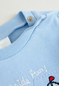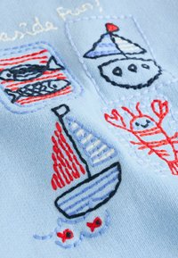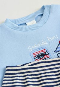 Sweat-shirt bleu clair pour tout-petit avec broderie sur le thème de la mer et leggings rayés bleu marine et blanc.
