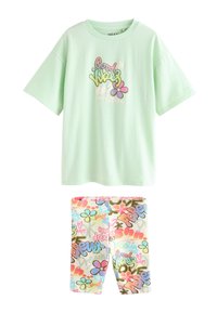 T-shirt bleu avec le texte "Papaya" et un tissu à motifs colorés de fruits tropicaux et de fleurs superposés sur le t-shirt.