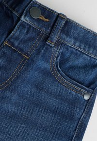 Shorts en denim bleu foncé avec revers roulés, ceinture élastique, patte de boutonnage à l'avant et style cinq poches.
