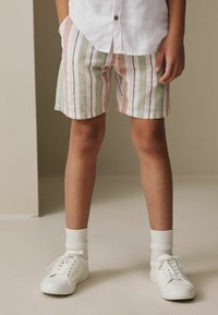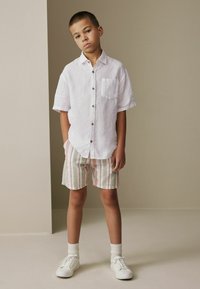 Garçon debout, les mains dans les poches, portant une chemise blanche à manches courtes boutonnée, un short rayé, des chaussettes blanches et des baskets blanches.