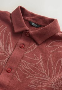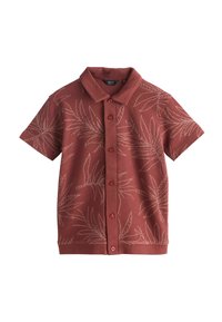 Chemise à manches courtes boutonnée en terracotta avec un motif discret de feuilles de palmier et un col classique.