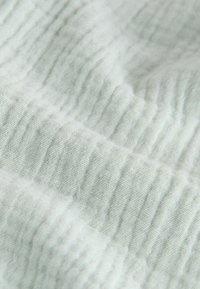Chemise à manches courtes vert clair avec boutons et short à taille élastique, tous deux fabriqués dans un tissu texturé léger avec de fines lignes verticales.
