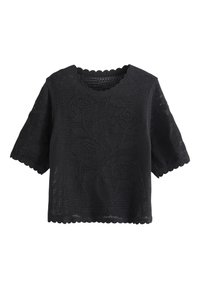 Pull brun en crochet avec motif floral, manches courtes, encolure et ourlet festonnés. Le tricot texturé met en valeur la dimension du vêtement.