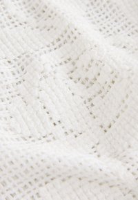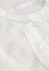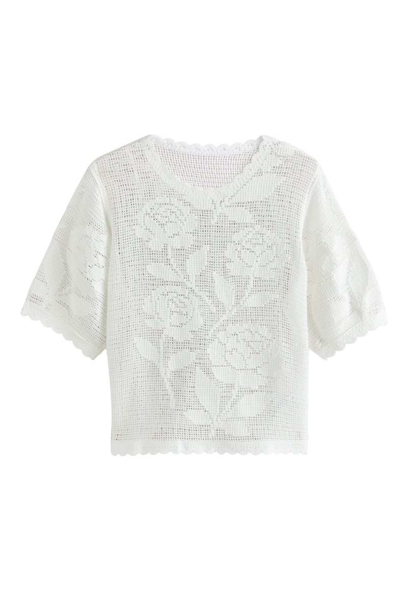 Haut blanc en crochet à manches courtes avec motifs floraux, bords festonnés aux manches, à l'encolure et à l'ourlet.