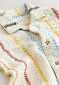 Chemise à manches courtes en crochet avec boutons sur le devant, dotée d'une poche avant, présentant des rayures verticales en bleu, jaune, marron et noir sur un fond crème.