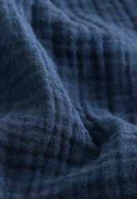 Chemise bleu marine à manches courtes avec boutons, tissu texturé et col, présentée à plat sur un fond blanc.