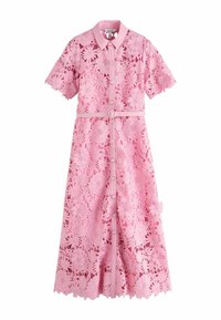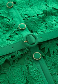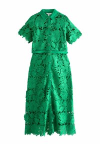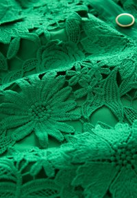 Robe midi en dentelle verte avec motifs floraux découpés, manches courtes, boutonnage sur le devant, col et ceinture assortie à la taille.