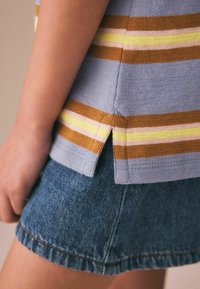 Jeune fille aux longs cheveux portant un polo rayé jaune, marron et lavande, ainsi qu'une jupe en jean, sur un fond beige.