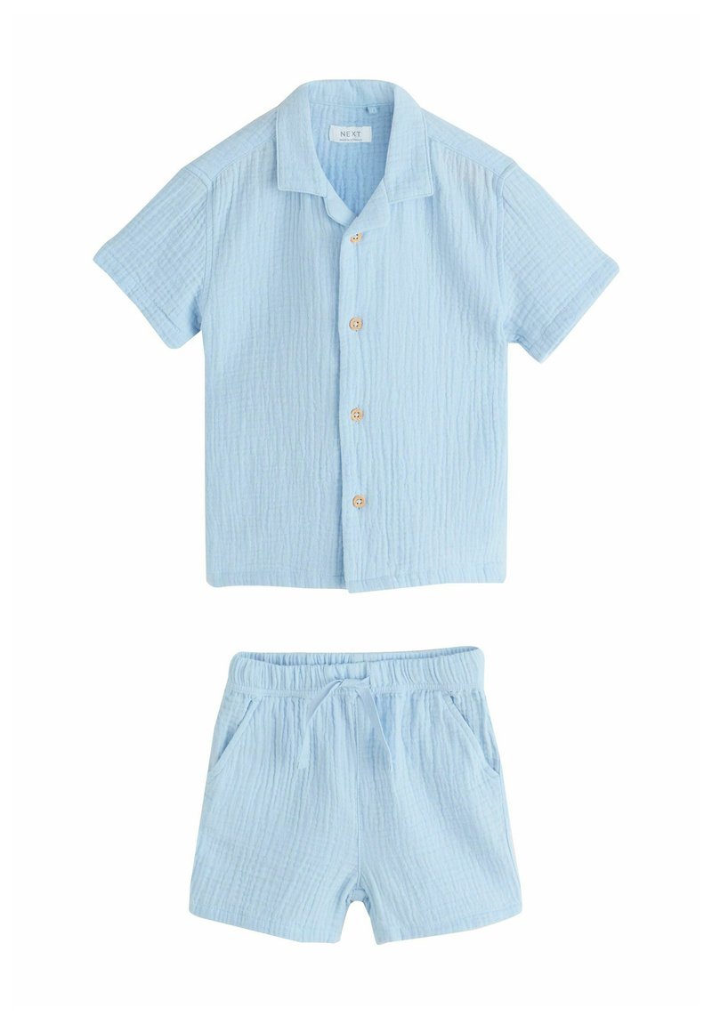 Chemise à manches courtes boutonnée en tissu texturé bleu clair et shorts assortis à taille élastique avec cordon de serrage, posés à plat sur fond blanc.