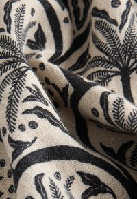 Haut sans manches en lin beige avec motif en arc botanique noir et petite fente en V au col.