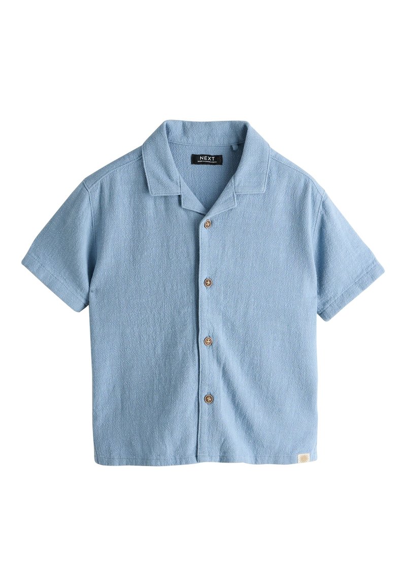 Chemise bleu clair à manches courtes boutonnée, en tissu texturé, boutons en bois et petite étiquette blanche en bas de l'ourlet.
