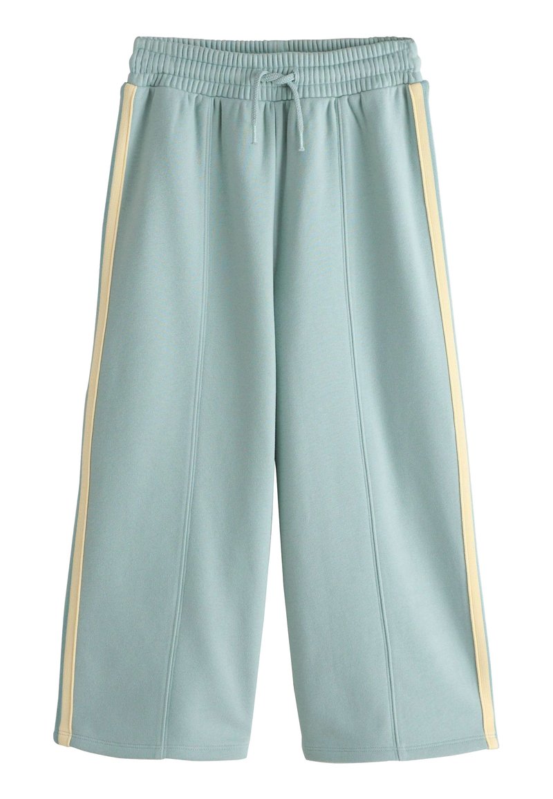 Pantalon large bleu clair avec taille élastique, cordon de serrage et bandes latérales beiges.