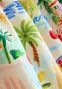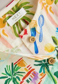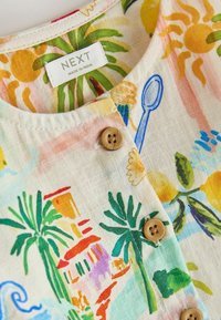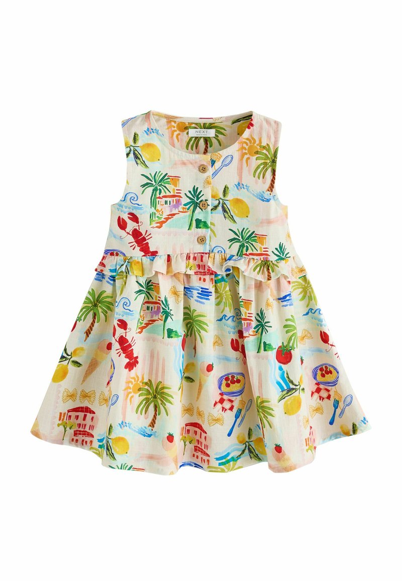 Robe sans manches pour enfants avec boutons en bois, imprimé coloré sur le thème tropical et alimentaire comprenant des homards, des palmiers, des citrons et des bols de pâtes.