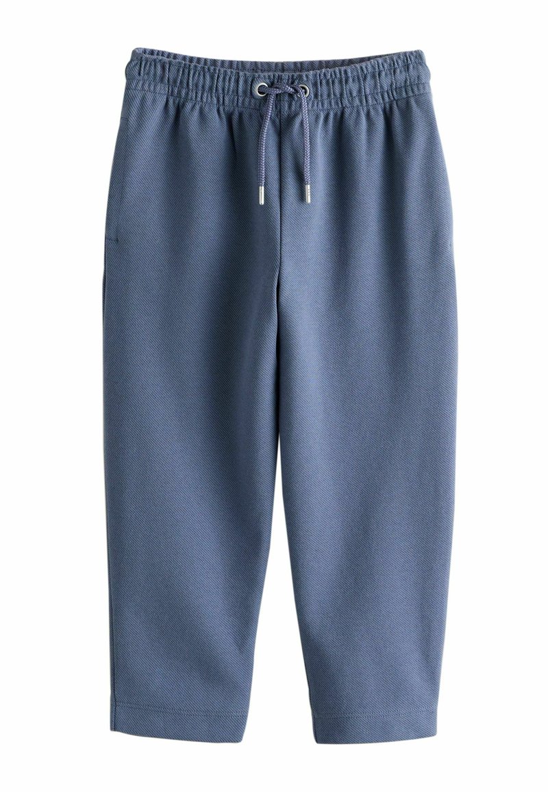 Pantalon de survêtement bleu en tissu doux, avec une taille élastique munie d'un cordon de serrage, deux poches latérales et des chevilles resserrées.