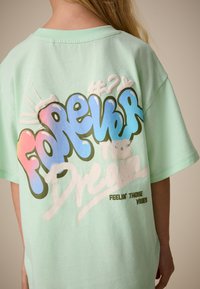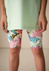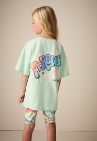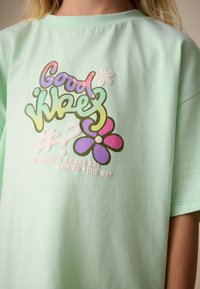 Fille blonde aux cheveux lâchés porte un t-shirt oversize vert menthe "Good Vibes" et un short coloré à motifs, debout devant un fond beige.