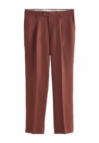 Personne portant une chemise à manches courtes beige clair, un pantalon vert ample et des chaussures en cuir marron, debout sur un chemin en pierre dans un cadre de jardin.