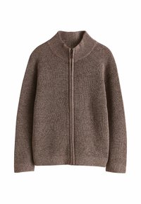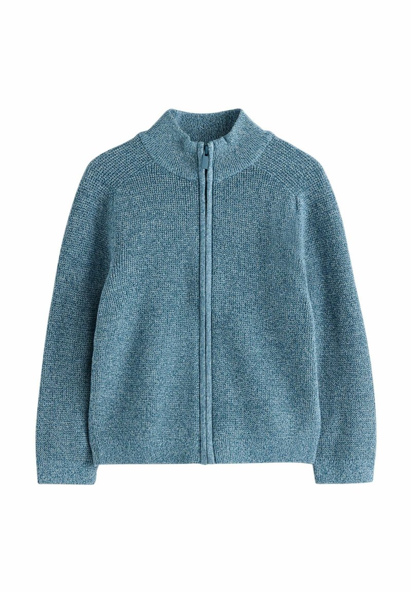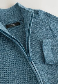 Cardigan bleu tricoté avec col montant, fermeture éclair intégrale, tissu texturé et détails côtelés aux poignets et à l'ourlet.